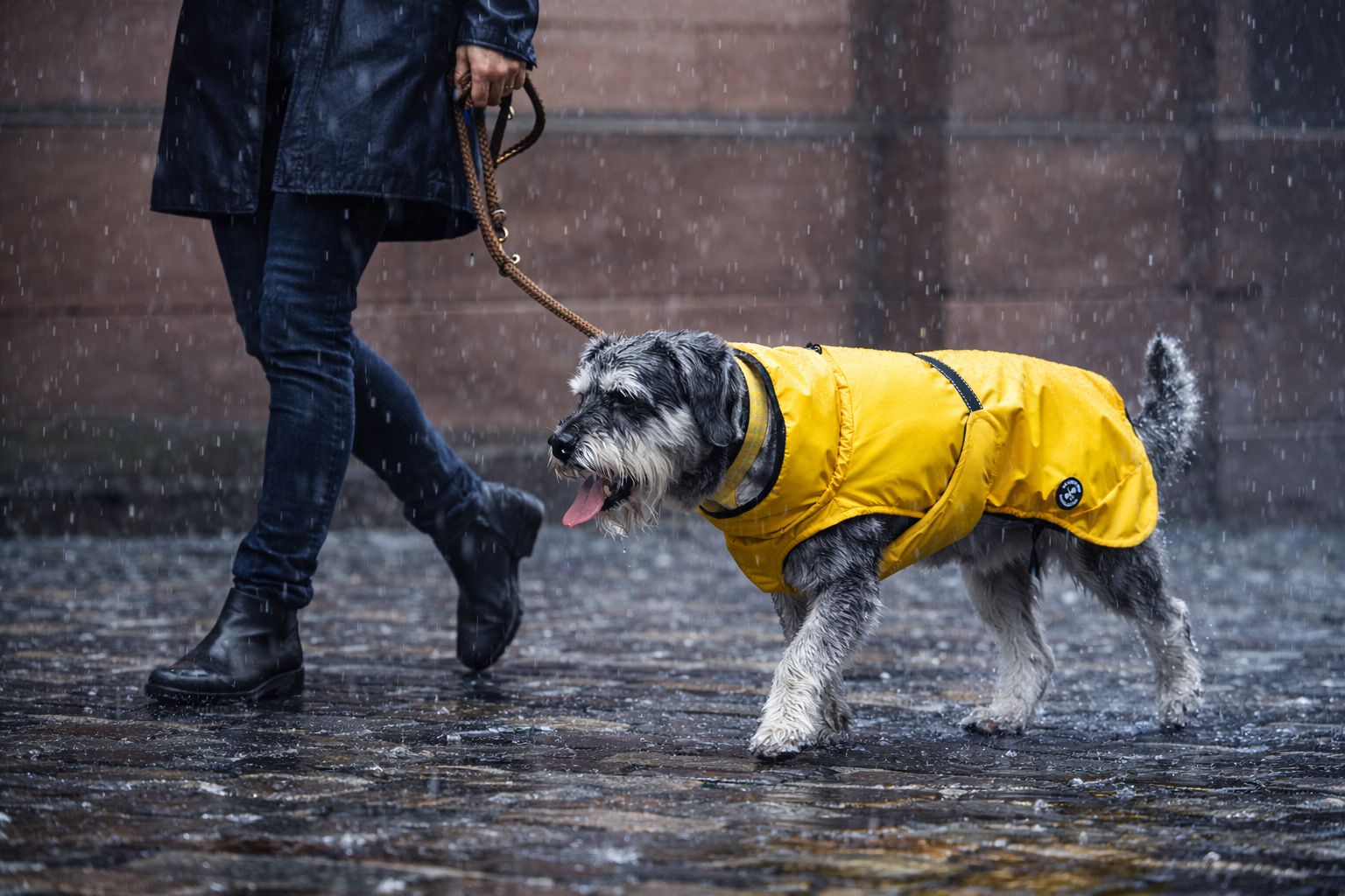 Unsere Regenjacken formen die Silhouette Ihres Hundes wunderschön und vermeiden den Zelt- oder Poncho-Look. Sie passen sich dank ihres leichten Futters perfekt an die Körperform Ihres Hundes an. Sie haben auch einen Leinenring für kleine Größen, so dass kein zusätzliches Halsband oder Geschirr erforderlich ist. Der Stoff ist sowohl wasserdicht (Wassersäule 10.000 mm) als auch atmungsaktiv.